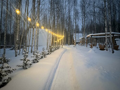 В домиках предоставляются халаты, тапочки, средства гигиены, листовой чай, молотый кофе с кофеваркой, разнообразная посуда и кухонная утварь. Кухня оборудована чайником, микроволновой печью, плитой. Для любителей барбекю предусмотрена мангальная зона с мангалом, дровами и решётками.