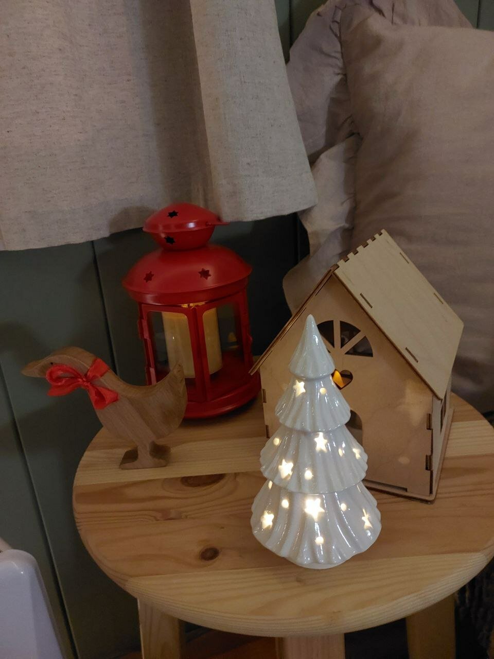 В «кукольном» домике было тепло и уютно: зажгли гирлянды, свечи и ностальгический фонарь-подсвечник из Ikea, рассмотрели нарядную новогоднюю ёлку и прочие милые детали интерьера. Особенно хороши были керамическая ёлочка-ночник и деревянная утка с красным бантом — наверное, нарядилась к празднику. Кухонька очень компактная, но было всё необходимое.