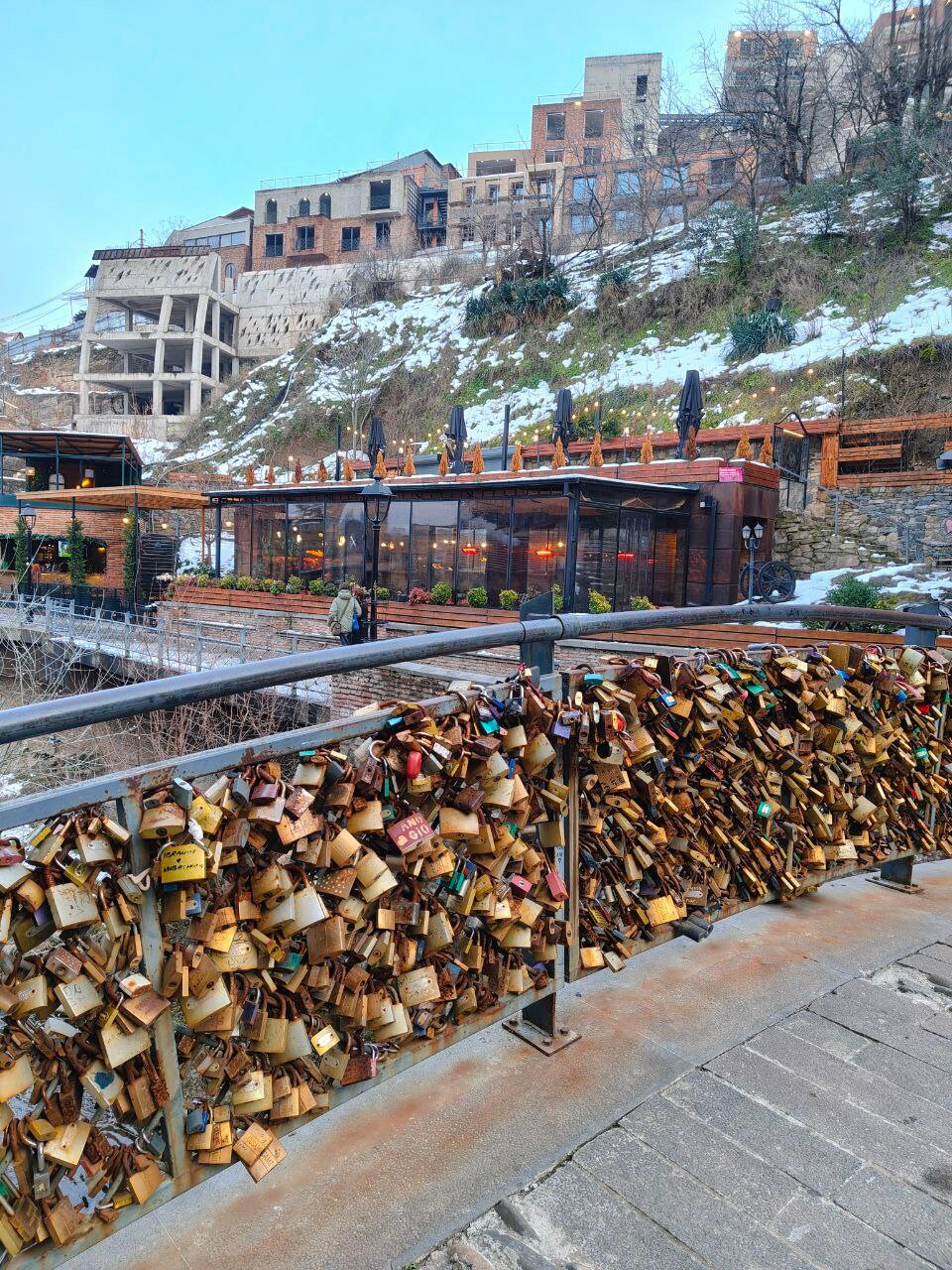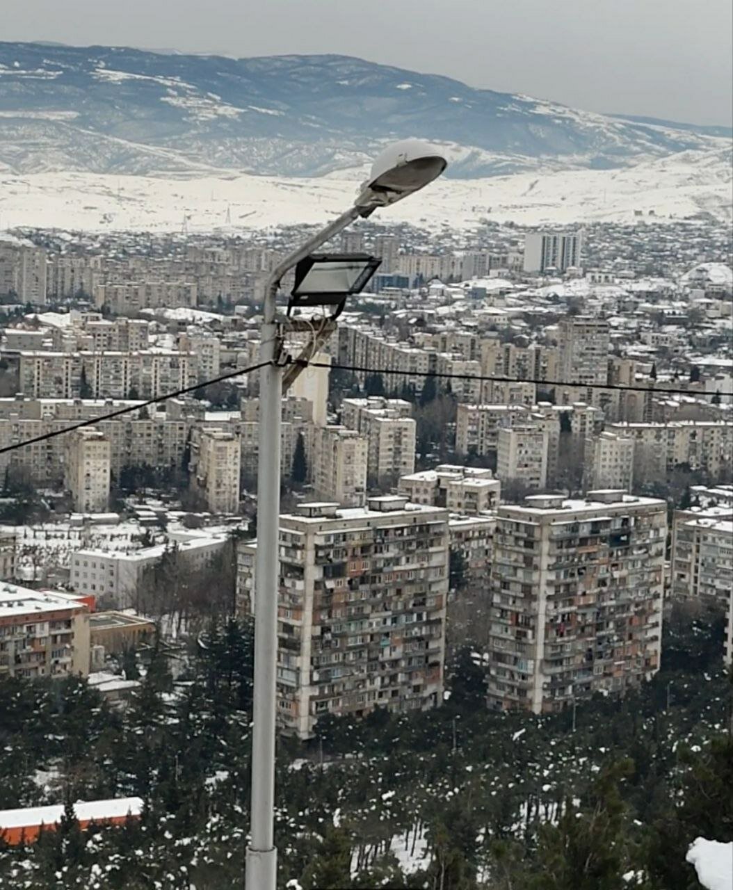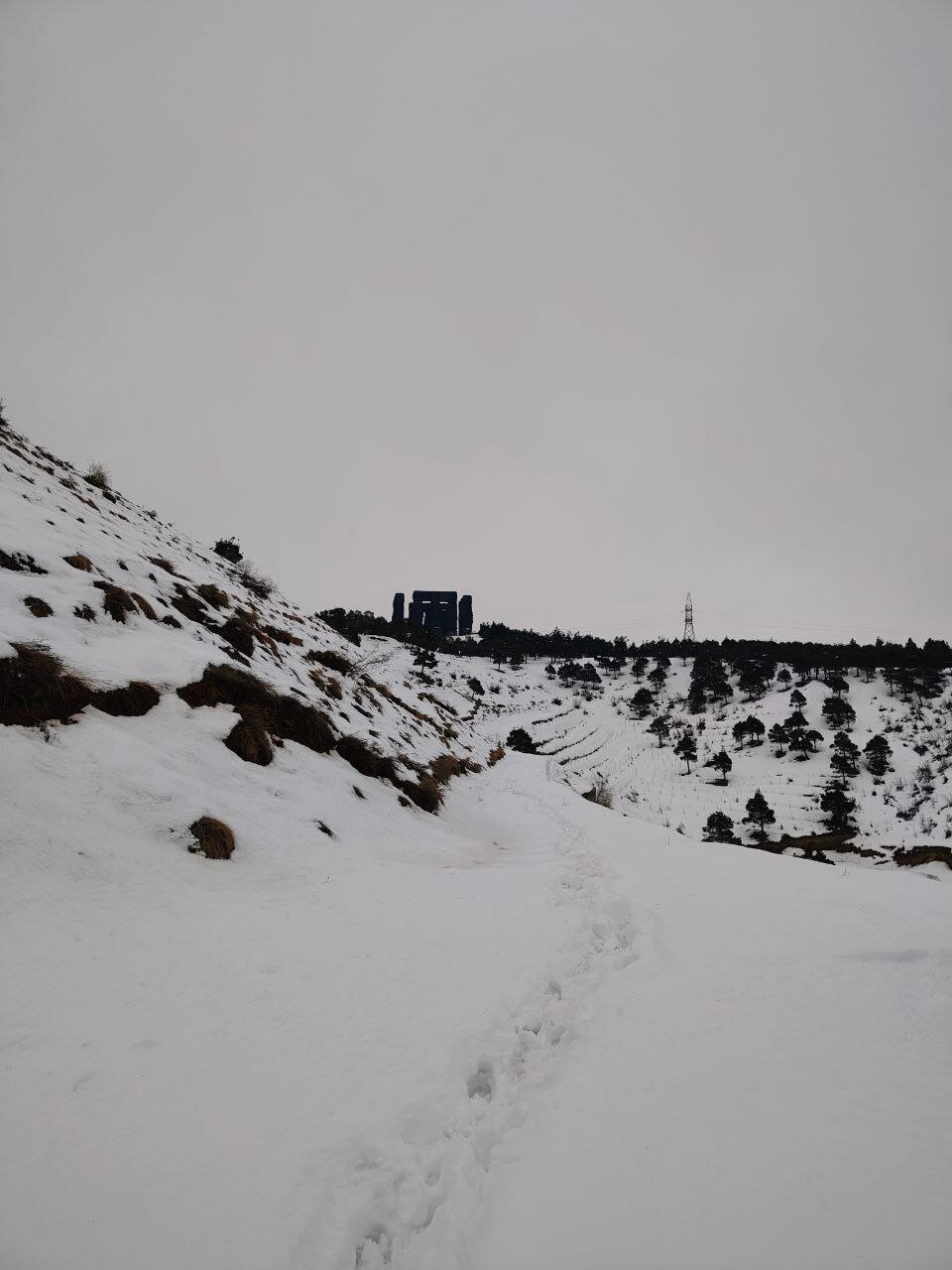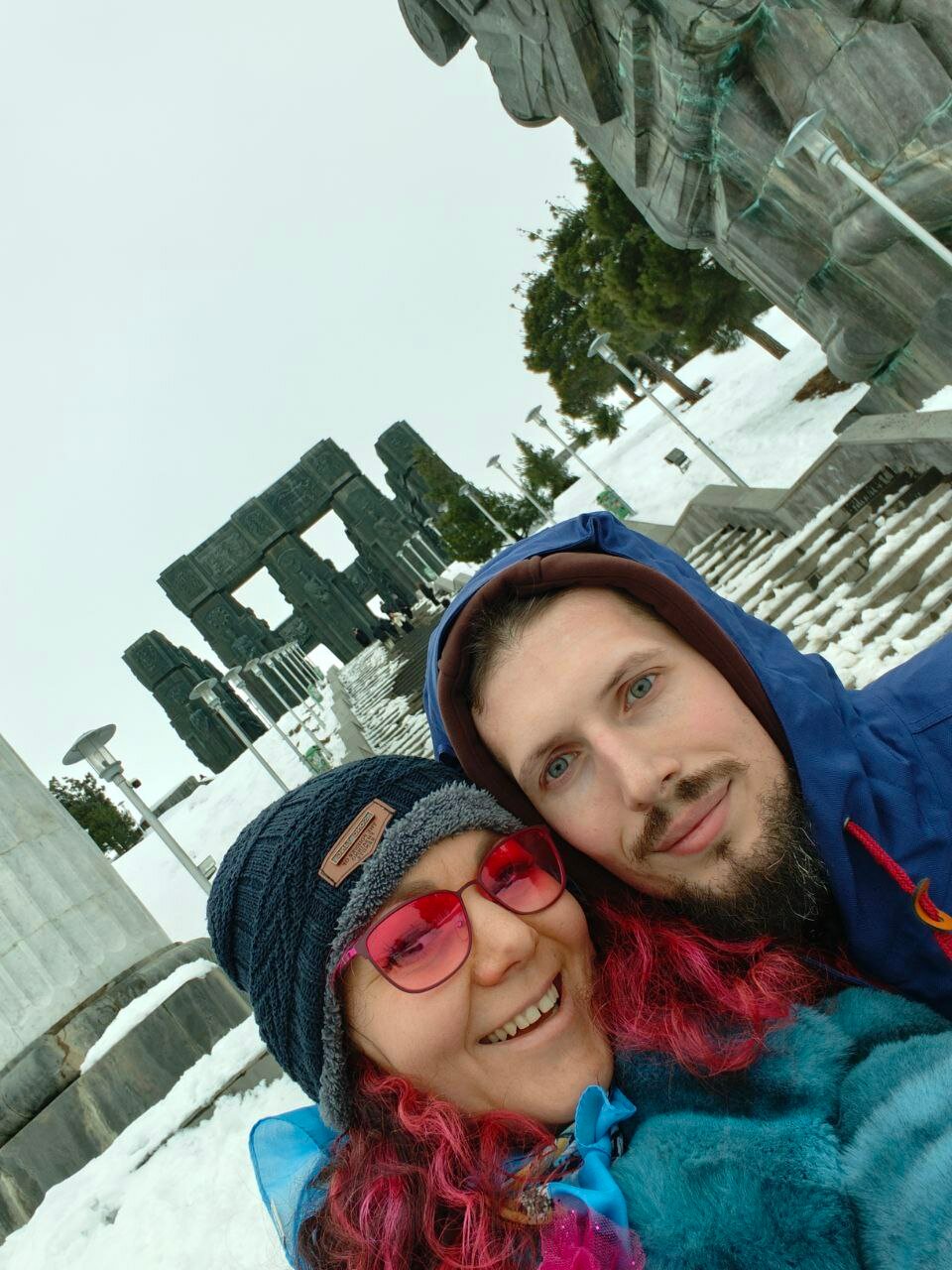 Но в итоге нам понравилось. Так как сам монумент не впечатлил ни капли (но это наше субъективное мнение, лично знаю человека, который просто в экстазе от него). А мы так, из уважения к своему пути сфоткались с мрачными черными колоннами, посмотрели на великое «Тбилисское море» и на какой-то грязный, как будто блохастый район задрипанных многоэтажек. То путь по пересечённой местности, в горку, по снегу чуть не по колено, наполовину по собачьим следам был самым впечатляющим в этом приключении).