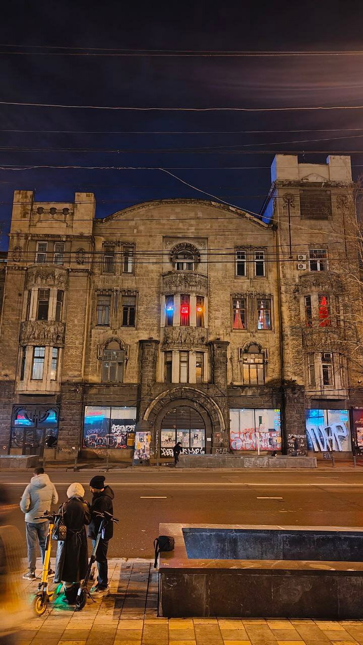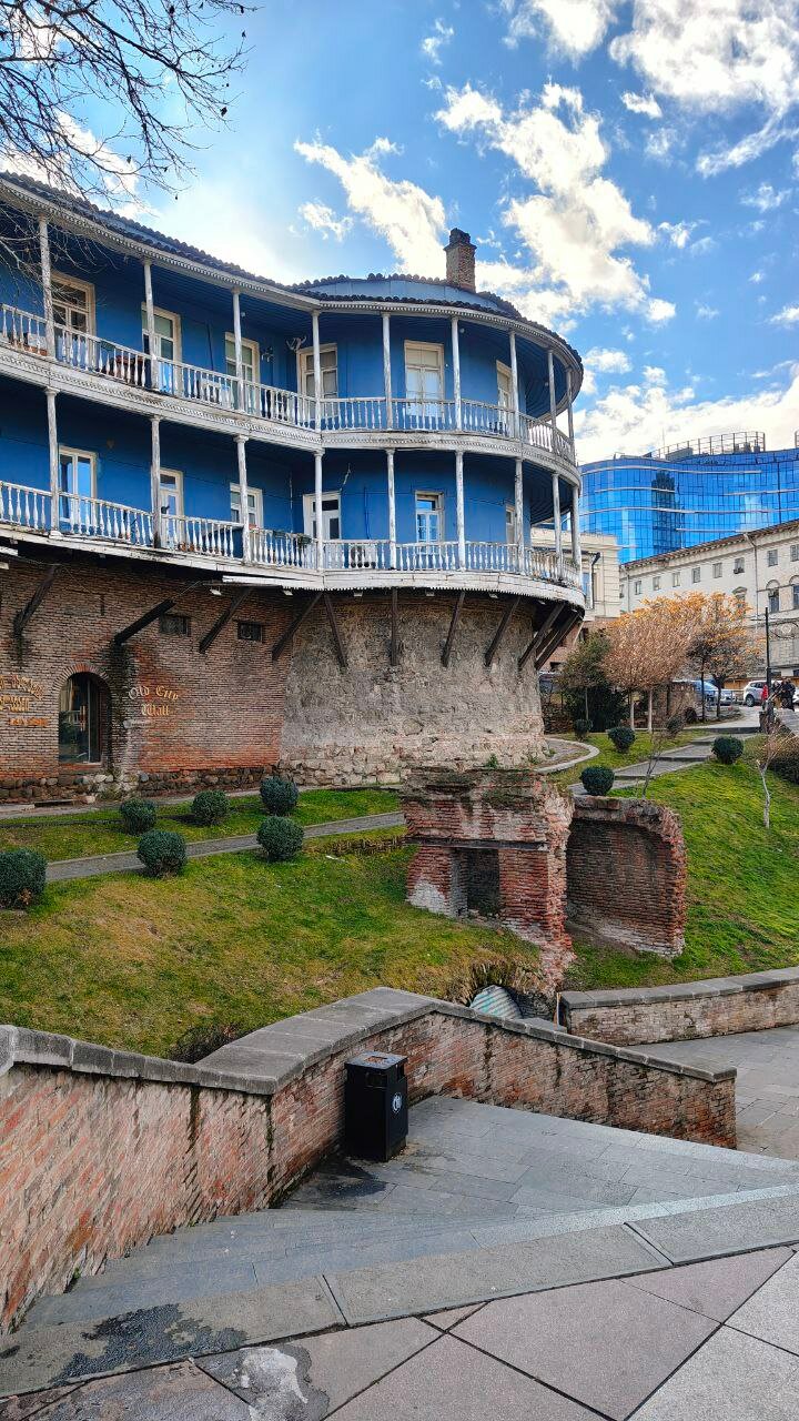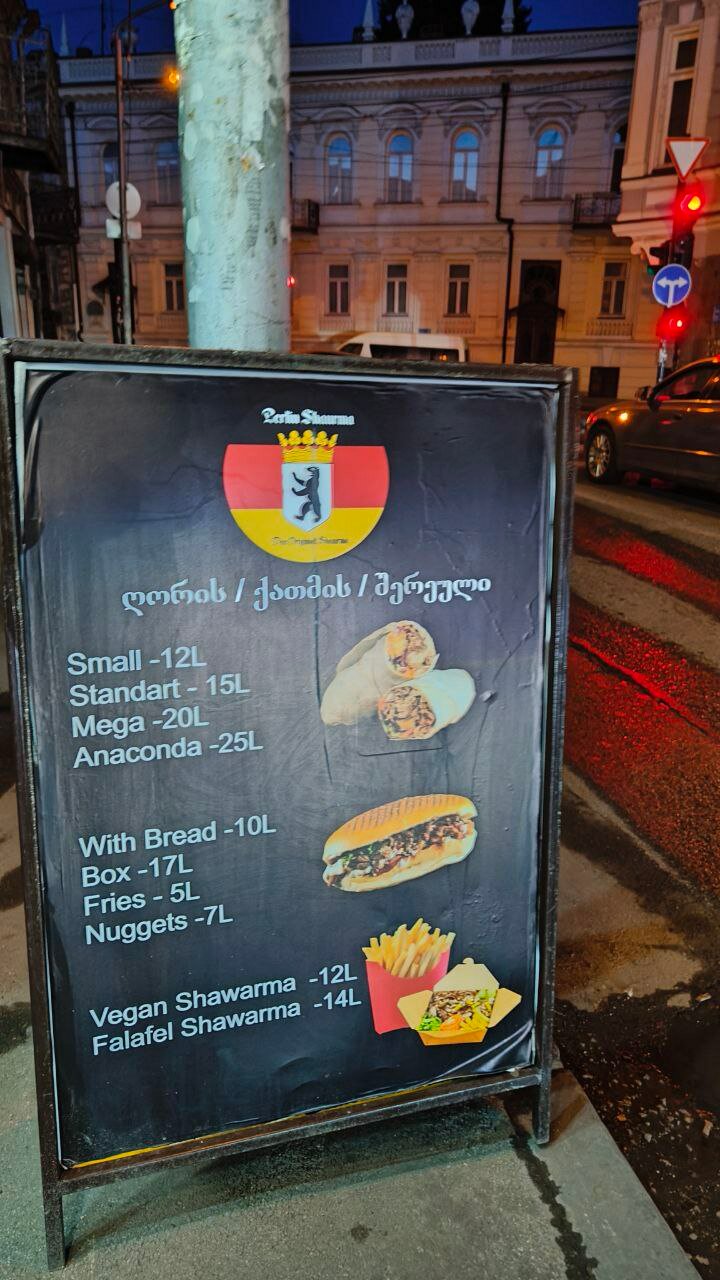 Вот тут улица Мосе Гогиберидзе, 14/11. По-моему, Berlin Shawerma называется. Два уличных столика и увесистая шавуха, непривычно с капусткой. Но так-то прикольная. Пока ждем шавуху, я фанатею от архитектуры.