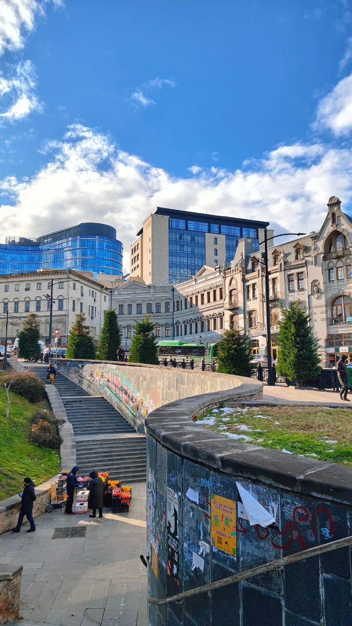 Пропустить его не получится, это мост за зданием Юстиции, похожим на серебристую грибницу опят. И торговля как будто разлита вокруг. Целые ряды картин, ковров, пластинок, китайской фигни и советских раритетов. Нам посоветовали НЕ брать здесь монеты и украшения, т. к. в основном Китай. И я это тоже заметила. Надо иметь хорошую насмотренность, чтобы не купить фигню. В «браслетах из камней», средняя стоимость которых, кстати говоря, около 7 тыс. рублей, из камней... Ни одного! Пластик и стекляшки. Зато в красивой коробочке местного бренда и с бусинкой с картой Грузии.