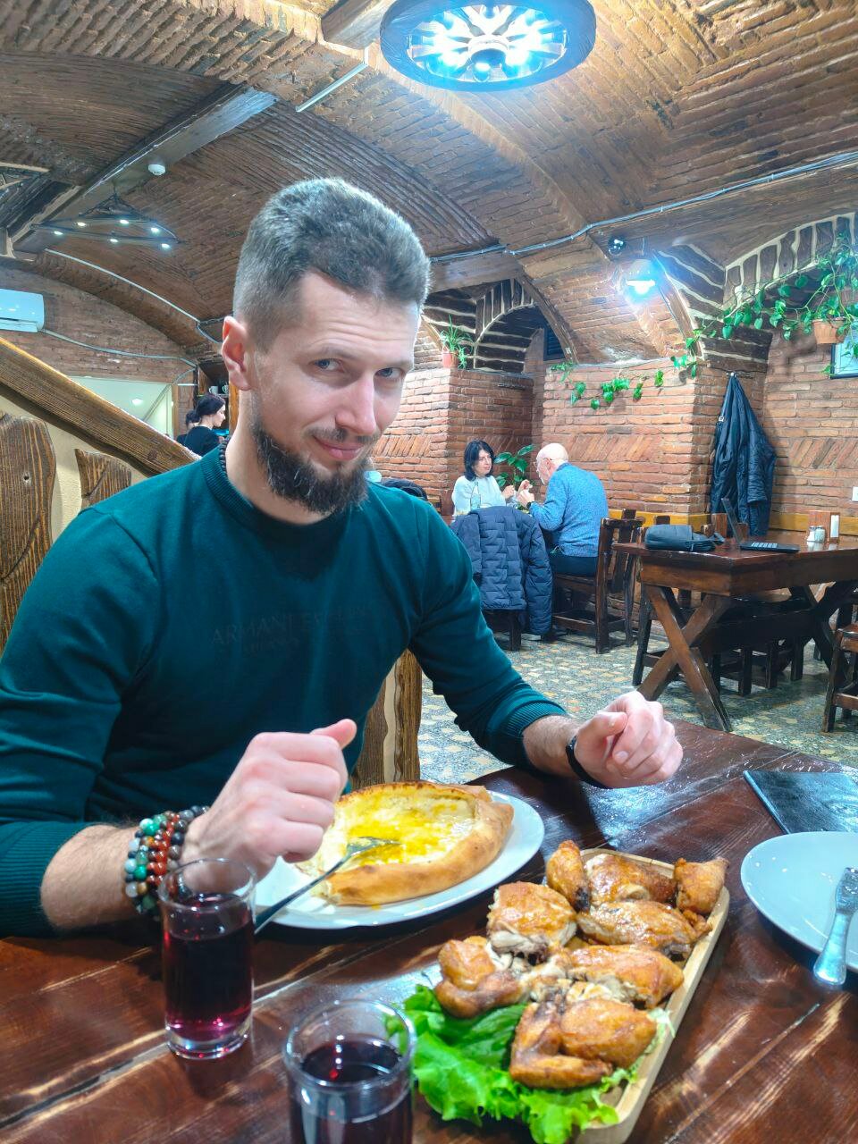 Но оказалось не оно. Ну ок, тут хинкали дешевле, чем на площади, народу тоже полно, пробуем! Меня распёрло ещё и на цыпленка тапака. Он шикарен! Так интересно его жарят — ножки отдельно, и получается, что всё-всё обжарено, очень понравилось. Алекс для разнообразия взял хачапури по-аджарски. Чек не сфоткали, объелись, ещё и домой ползаказа завернули.