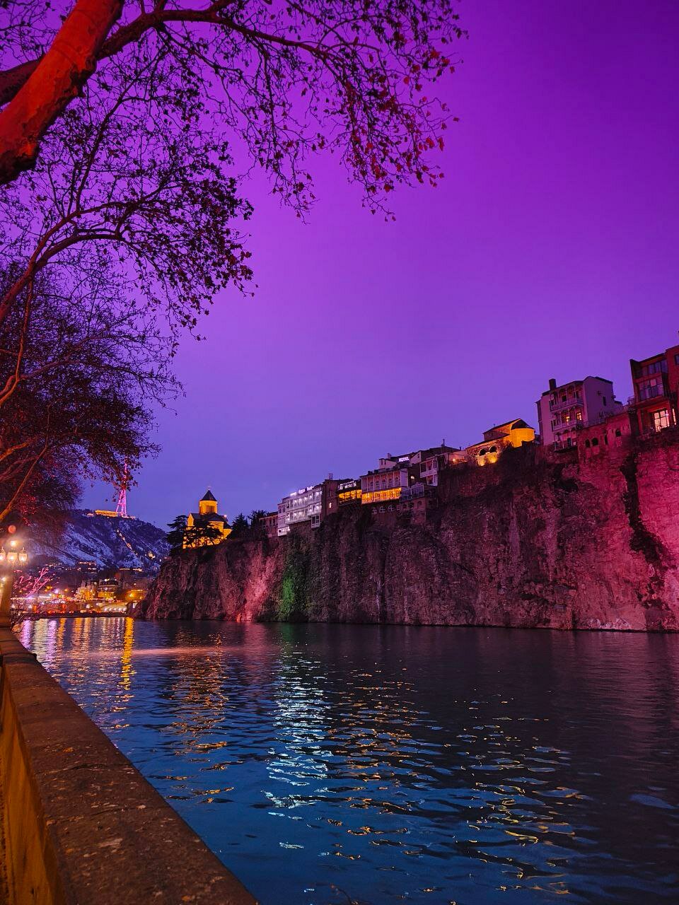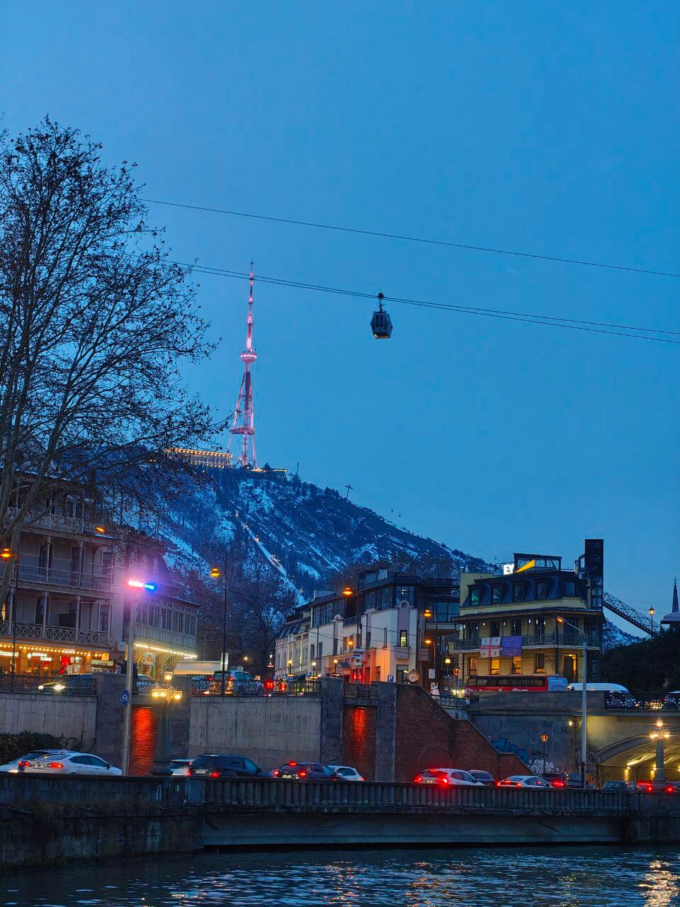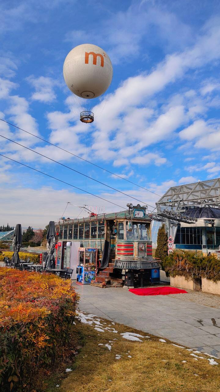Потом улочками и закоулками на «косой трамвай», идущий только в одном направлении, — Мтацминда-парк. Очень удачно уезжаем на рейсе в 18:00. Как раз зажигаются фонари, но в целом вид на город ещё дневной и потрясающий😍. Хотя мы читали много отзывов, что не стоящее дело и вообще дорого. По факту — подъём на двоих (24 лари) + карточка парка (ну никак без неё, 2 лари) — 730₽. Столько же будет и спуск на канатке. Заняли передние (то есть нижние) места — я была в восторге). Неспешно шлындаем наверху, панорамы действительно впечатляющие! Есть колесо обозрения, но я с них в принципе не прикалываюсь, так что не катались.