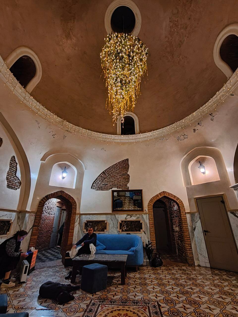 Час индивидуального номера с горячим и холодным серным бассейном — 150 лари (если на компанию, вообще выгодно) и скрабирование кесе по 20 лари с носа. Итого 190 лари (~5300 рублей) за релакс. Нам вполне хватило часа. И не перепарились, и расслабились. Волосы можно сушить в зоне отдыха на ресепшене. Пока валялась в горяченькой водичке (типа нашей Суворовки, только колоритно), рассматривала кладку потолка. Узнала на ресепшене — здание старинное, так строили. Кайфую от бережности местных к наследию.