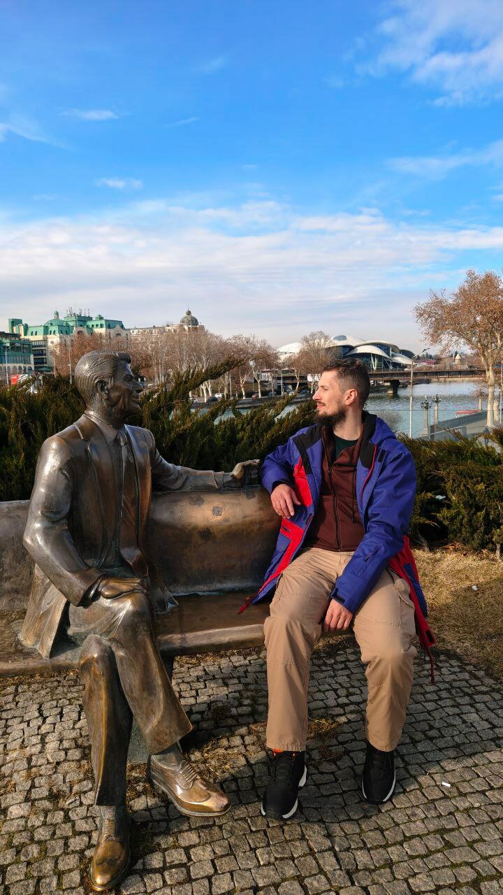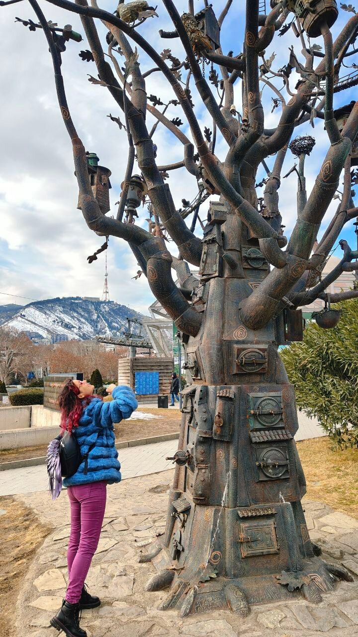 Это город потока, и он показывает нам статую Рейгана, удивительное стальное дерево, сувенирные монеты у входа на канатку (на этот раз картинка мне нравятся, и я беру себе сувенир за 10 лари (~280₽) и... очередного русскоговорящего гида старой закалки! Он нам советует (уже не первый) прокатиться не на этой канатке, поднимающую на мать-Грузию и дальний вход в дендрарий (куда мы в силу зимы не собираемся, там и летом-то не густо красот), а на дальней, которая поднимает на Мцминду, там парк развлечений (нам не надо, но гора повыше) и 2-й уникальный транспорт Грузии — косой трамвай. И я никак не смирюсь с тем, что у них он называется фуникулёр, когда у нас так называют канатку🥴.