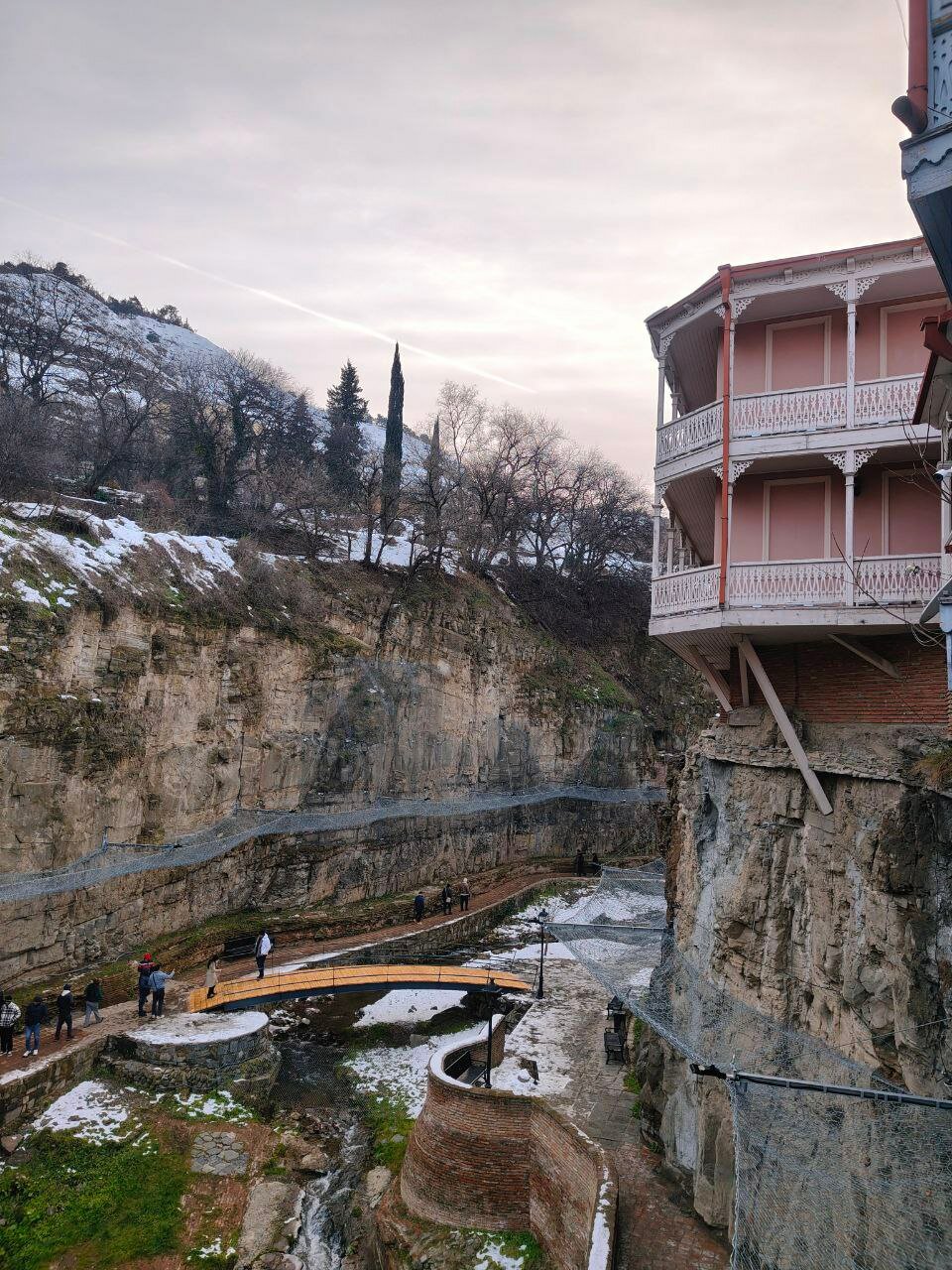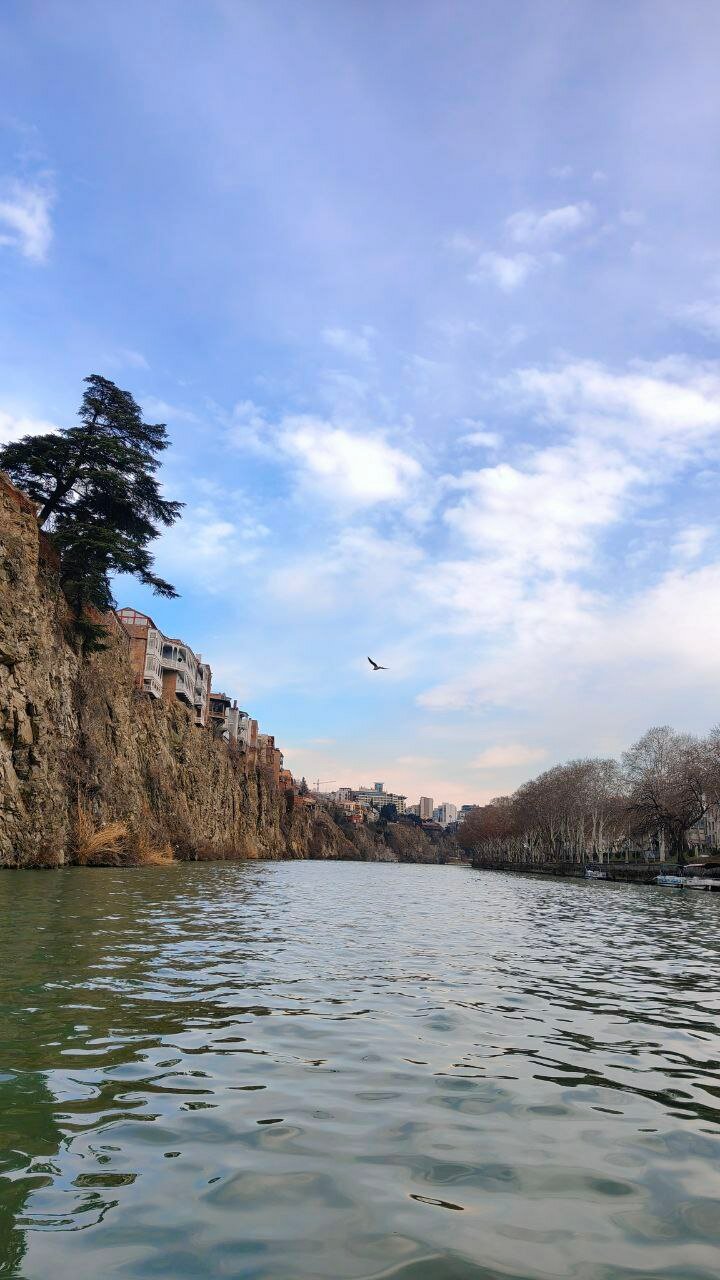 Наше жильё... Это песня! Один из домов вровень с отвесной скалой возле Легвтахевского водопада. Вид прямо в ущелье, шум водопада, смотровая площадка прямо у нас во дворе, как и вход в дендропарк и башня Нарикала (на реставрации). Радушные русскоговорящие хозяева показали нам наши двухуровневые покои и умчались на дачу. А мы ещё долго не отлипали от окон) Спится под шум водопада просто замечательно! Квартира, кстати, с отоплением! Что мне, мерзлячке, принципиально важно.