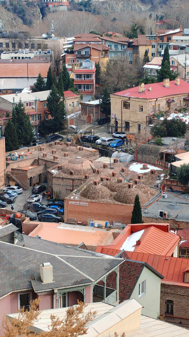 Из нашего прекрасного дома практически видно Абанотубани. Вообще это название самого района. Технически — чуть ниже водопада комплекс торчащих из земли кирпичных шапочек. Это крыши бань. Сайты советуют нарядные «Пушкинские» (голубой мозаичный фасад, «Пестрая» или Орбелиановская), а местные — «в которых воду чаще меняют» — бани Гуло/Царская. Заходим узнать, оказывается, работают до 3-х, записываемся, мчим за вещичками и на процедуру! Общие бассейны нам все дружно НЕ рекомендовали, поверим на слово.