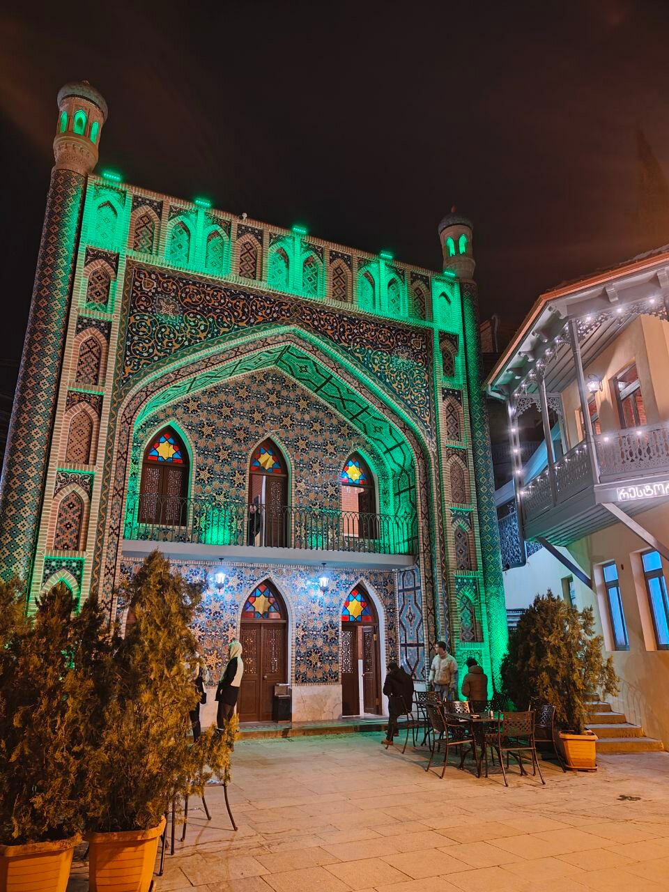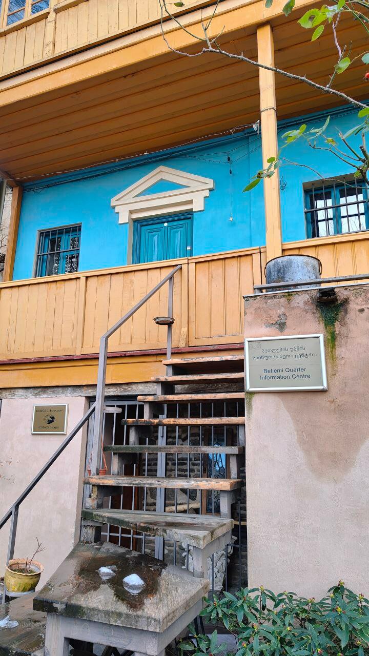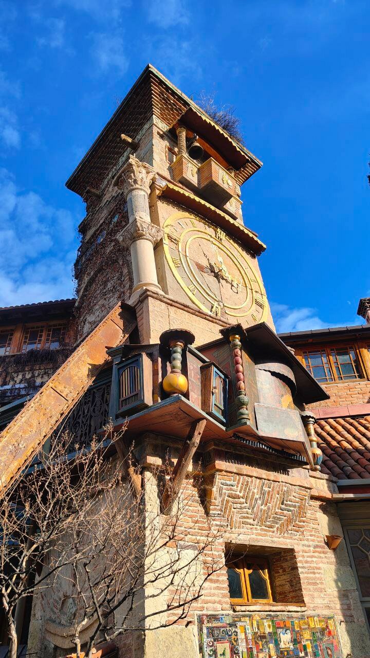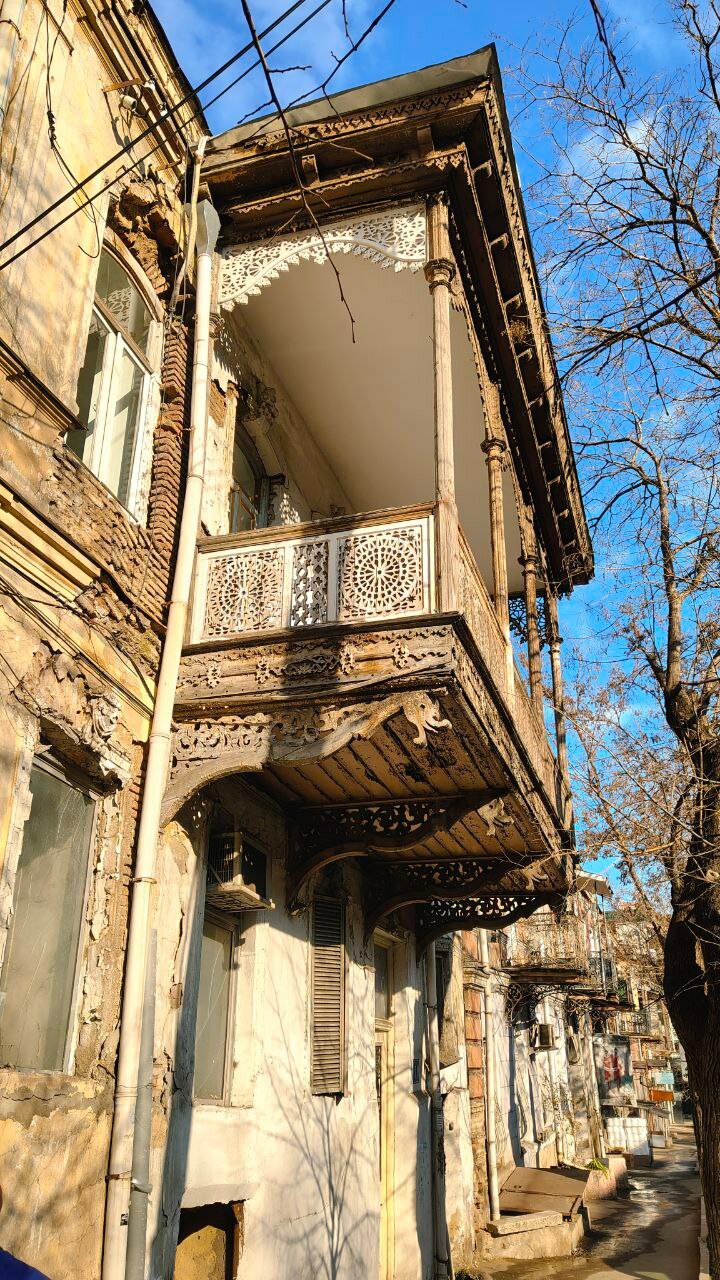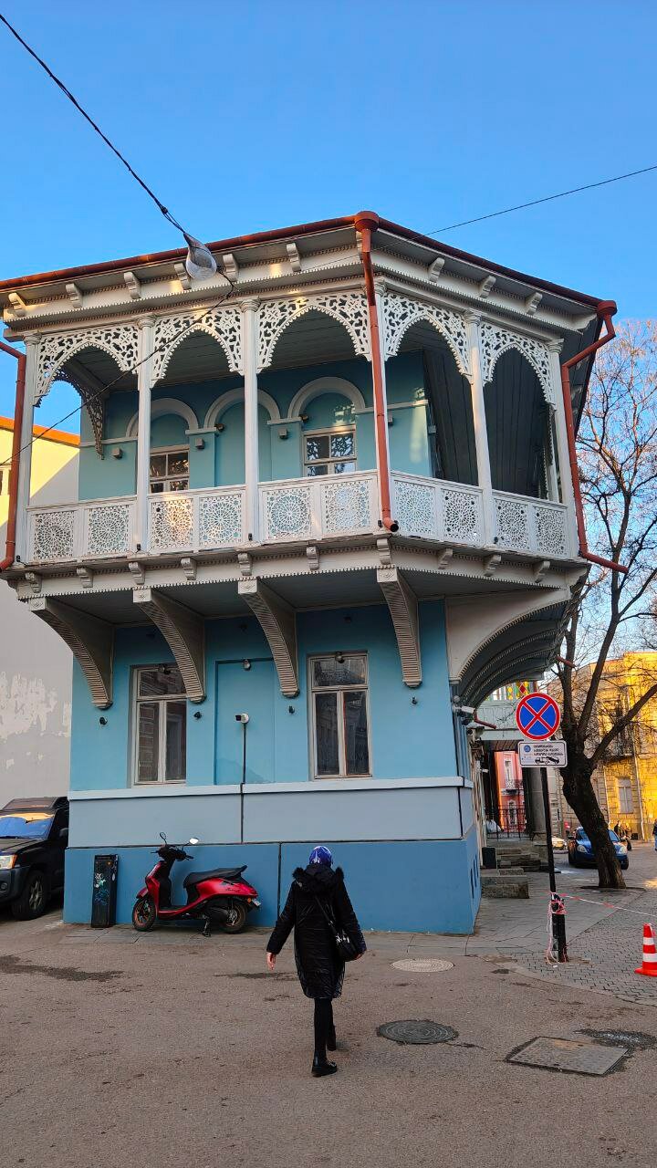 Утро начинается с любования видом из окна и получасовым спуском по улочке вместо трёх минут, потому что рассматривать хочется всё! Не улица — музей! Кстати да, прямо в доме картинная галерея, а в соседнем — единственная в Тбилиси мечеть, очень необычная.